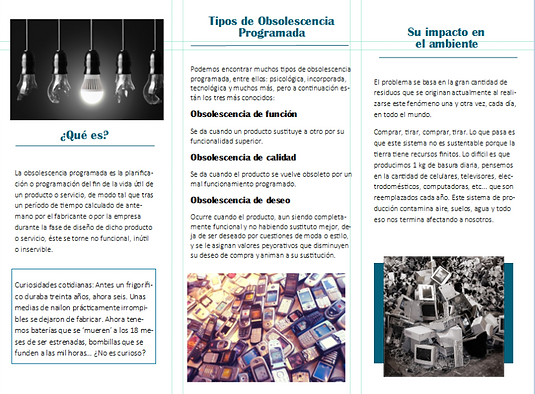 El plan lógico original si fue cambiado, por algunas complicaciones y por la falta de tiempo, pero al diseño elegido no se le cambió el orden, pero si se le cambió algunas cosas como: ya no se le puso la definición de algunos tipos de obsolescencia progrmada, y solo se le pusieron a los más comunes. También ya no dividi los subtemas de "¿Cómo nos perjudica?" y el ¿Cómo los beneficia?", en cambio los puse juntos en un parrafo.